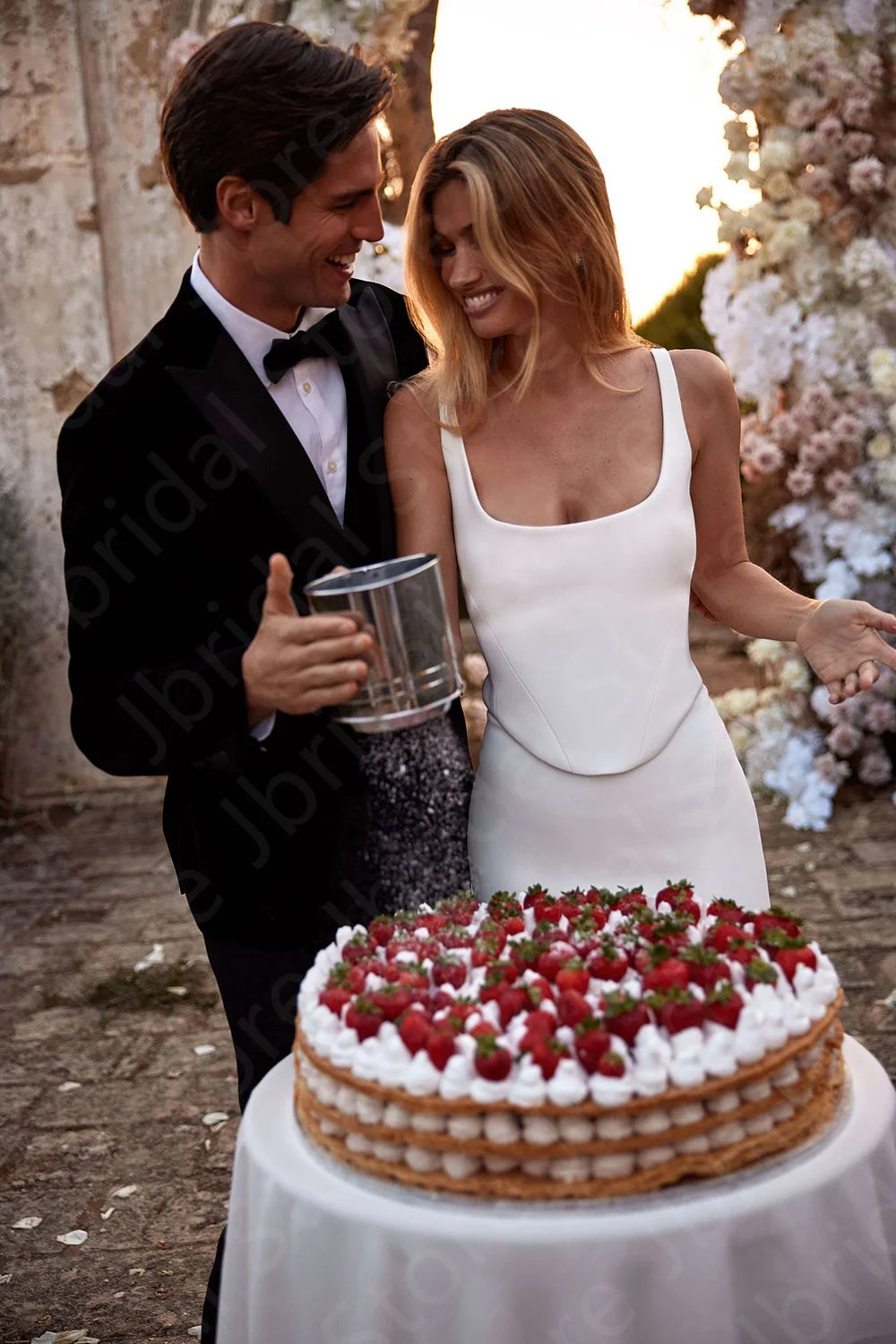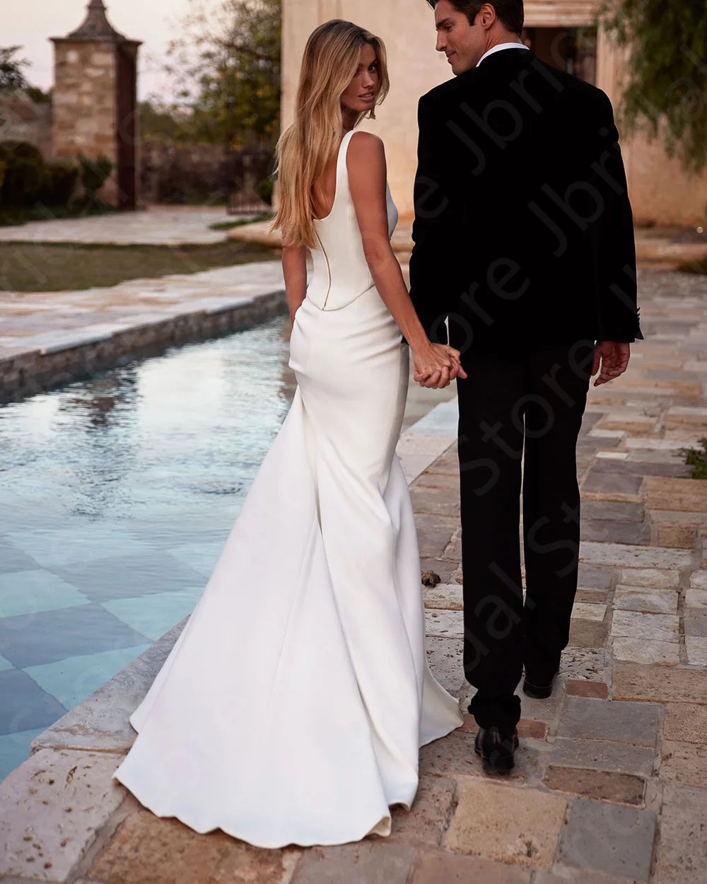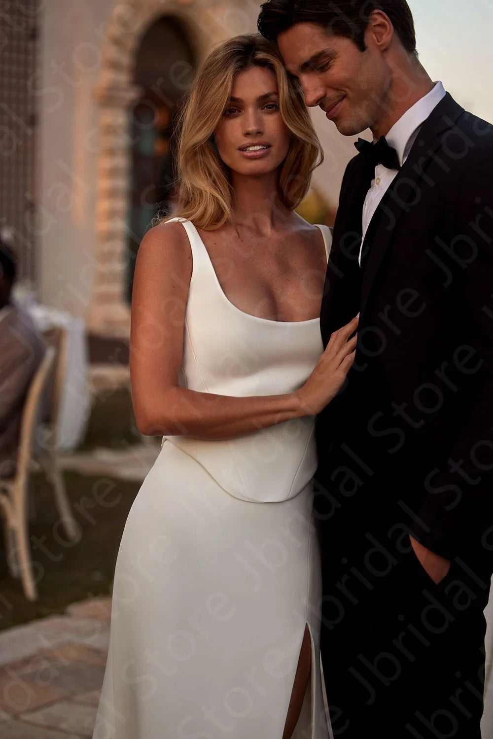 Boho Corset Wedding Dress Thigh Slit Sleeveless Mermaid Bridal Gown, slip into effortless elegance with this stunning boho mermaid gown that's anything but basic. The satin corset bodice hugs your curves in all the right ways, while the daring thigh-high slit keeps things flirty and fun. A sweeping train adds that dreamy princess moment, and the simple square neckline? Pure sophistication. Perfect for the bride who wants to feel like a goddess without breaking the bank—because your big day shouldn't come with a big price tag.