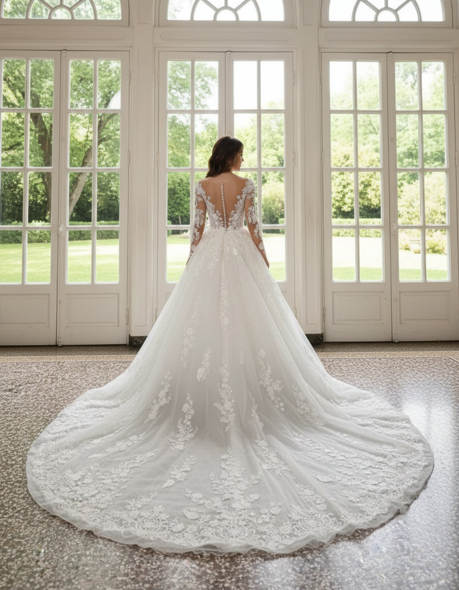 Boho Wedding Dress Tulle V-Neck A-Line Lace Pleated Bridal Gown, Walk down the aisle in effortless elegance with this stunning A-line wedding dress. The romantic V-neckline draws the eye while delicate lace illusion sleeves frame your shoulders with ethereal grace. An enchanting illusion back adorned with vintage-inspired buttons adds an unexpected touch of sophistication. The flowing court train creates a dramatic silhouette that photographs beautifully without overwhelming your frame. Perfect for the modern bride seeking timeless romance with contemporary style, this gown combines boho charm with refined bridal beauty for your most memorable moment.