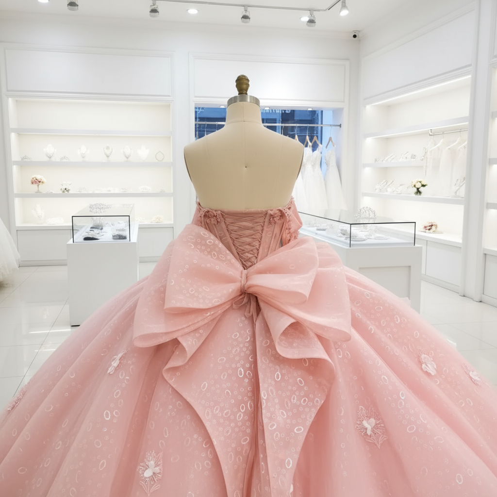 Quinceanera Dress Pink Beaded Party Ball Gown, this Off-The-Shoulder Pink Beaded Ball Gown Quinceanera Dress offers a stunning blend of classic elegance and modern design. Adorned with intricate floral embellishments, the gown features a flattering princess waist that enhances the silhouette. The corset-style sweetheart bodice is beautifully complemented by delicate off-the-shoulder cuff sleeves, creating a graceful neckline. An oversized bow with flowing ruffles adds a refined statement to the back, balancing sophistication with charm. The lace-up lower back ensures a customizable and secure fit, making this dress perfect for a memorable celebration where style and comfort are equally prioritized.