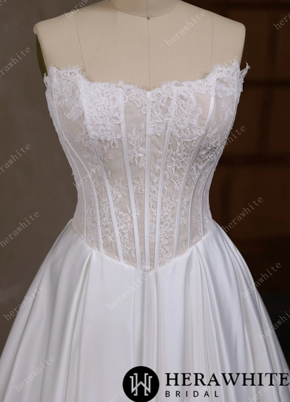 Experimenta la sofisticación de este vestido de novia con hombros descubiertos y una sensual abertura hasta el muslo. Con un estilo ajustado y un elegante drapeado que realza la cintura, este vestido es una versión moderna de la moda nupcial tradicional. Las mangas de encaje transparente aportan un toque delicado y femenino, mientras que la elegante falda fluye con gracia. La cola desmontable, que se vende por separado, ofrece opciones versátiles de estilo y sin duda será un detalle destacado.