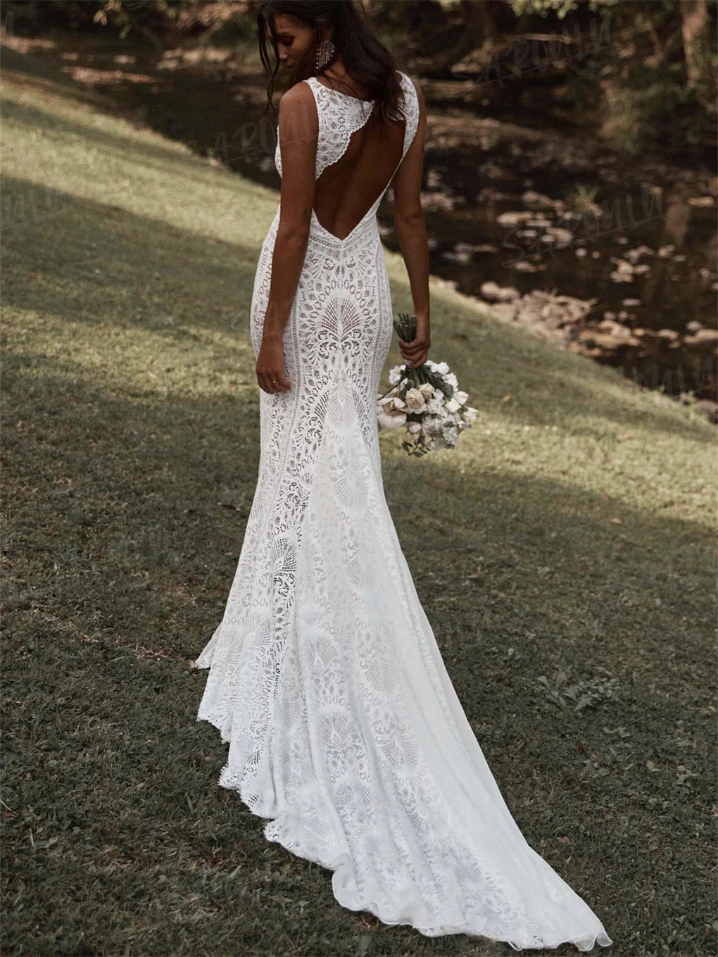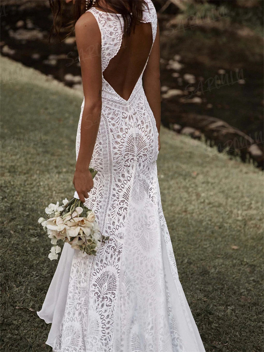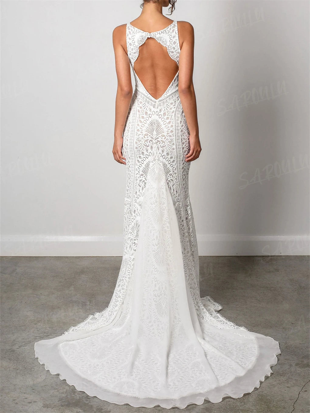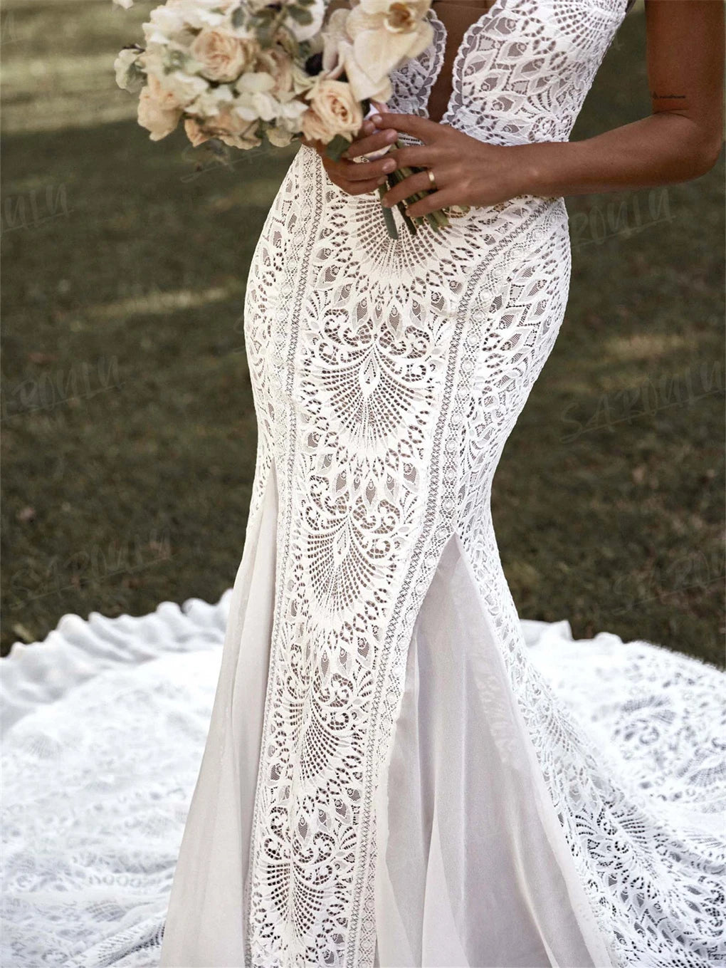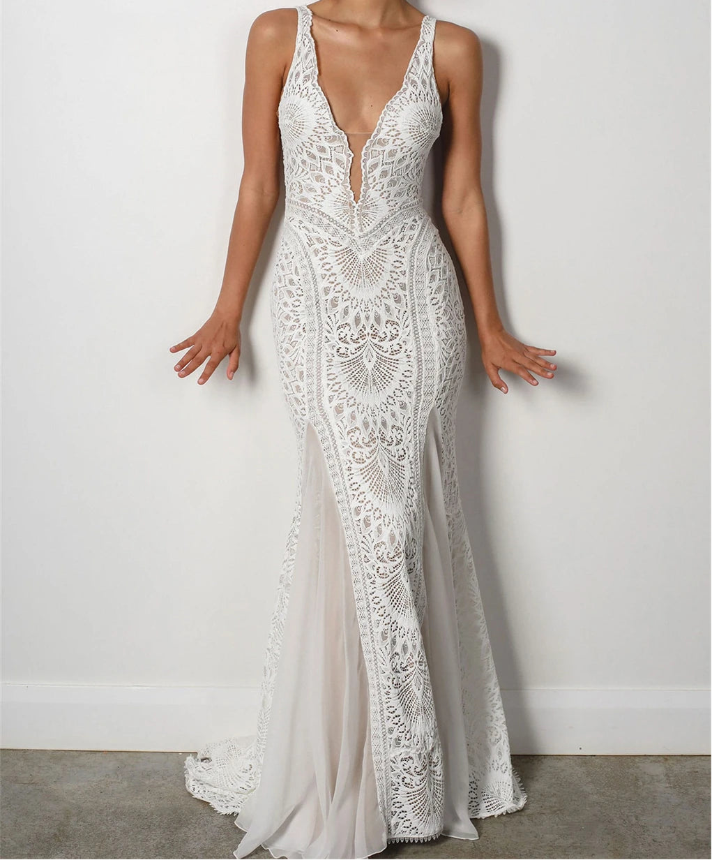 Sheath Bohemian Wedding Dress Long Deep V Neck Lace Bridal Gown, embrace your inner free spirit in this stunning bohemian wedding dress that perfectly blends romantic lace with contemporary edge. Featuring a daring deep V neckline and cheeky open back detail, this sleeveless mermaid silhouette flatters with strategic leg splits and a lightweight overlay for effortless movement. The delicate lace front pairs beautifully with flowing chiffon layers that floats across the train, creating that dreamy boho-bride moment. Perfect for the adventurous bride who is looking for a boho chic dress on her big day.