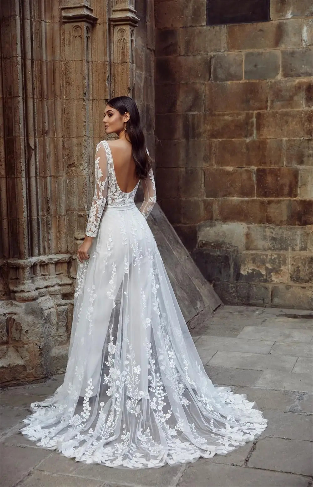 Wedding Lace Boho Jumpsuit Removable Train Illusion Lace Bridal Suit, step into the spotlight with this show-stopping boho bridal jumpsuit that breaks all the rules in the best way possible. Featuring delicate illusion lace sleeves, a daring open back, and a flattering scoop neckline, this piece celebrates modern romance with effortless style. The fitted lace bodice flows into chic wide-leg pants, while the detachable lace train lets you choose your moment—keep it on for the ceremony or remove it for dancing the night away. A convenient waist zipper ensures comfort when you need it most. Perfect for the bride who refuses to be ordinary.
