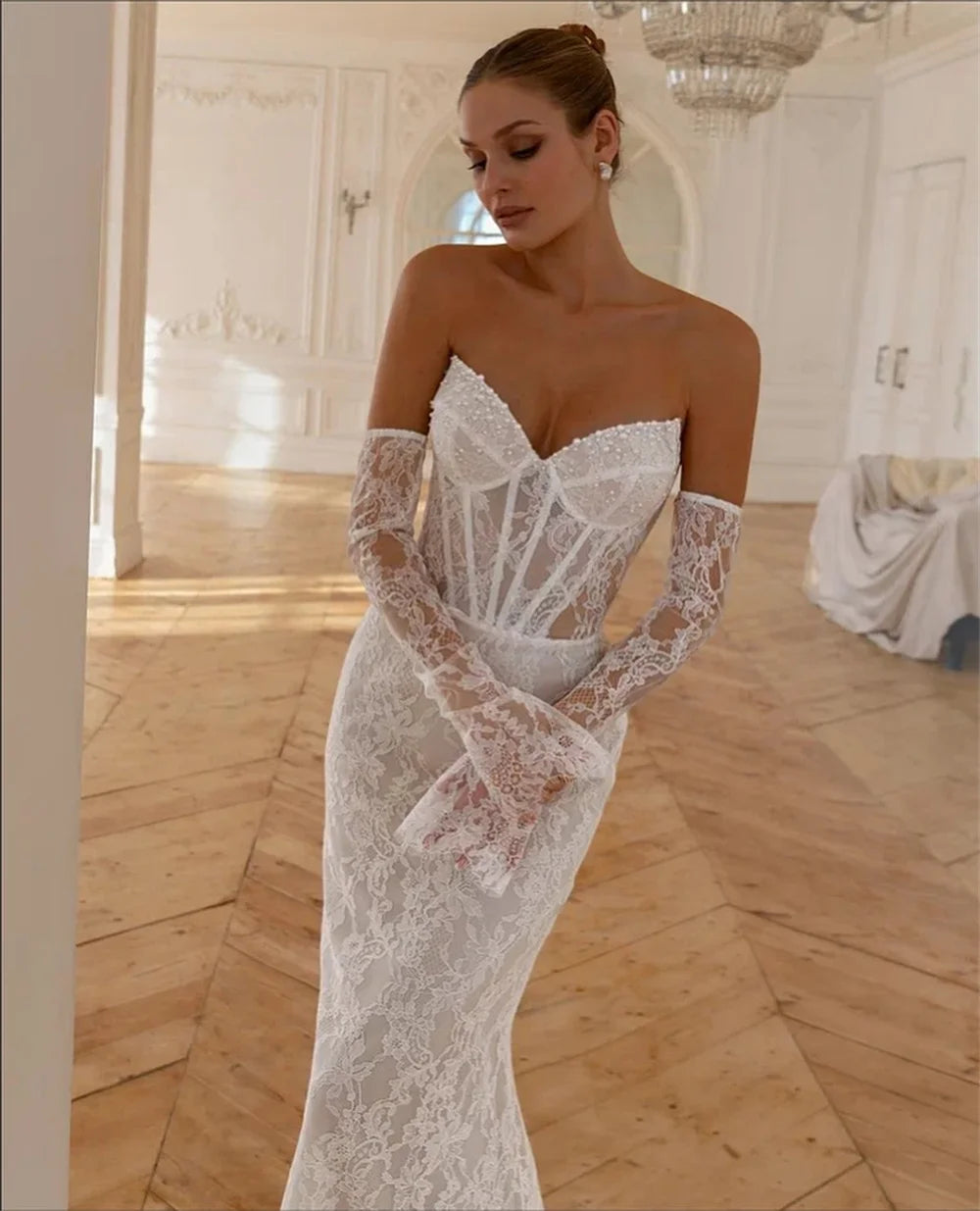 Boho Mermaid Wedding Dress Mermaid Corset Bridal Gown, Embrace your inner romantic with this stunning boho wedding dress that's equal parts ethereal and dramatic. Sheer lace drapes the entire silhouette while a structured satin corset bodice keeps things chic and supported with delicate shoulder straps. Detachable lace sleeves let you switch up your vibe throughout the day, and the daring low back adds just the right amount of allure. Side satin peplums bring unexpected flair, while the sweeping lace train ensures you'll make a grand entrance. Pure magic for the bride who refuses to choose between romantic and show-stopping.