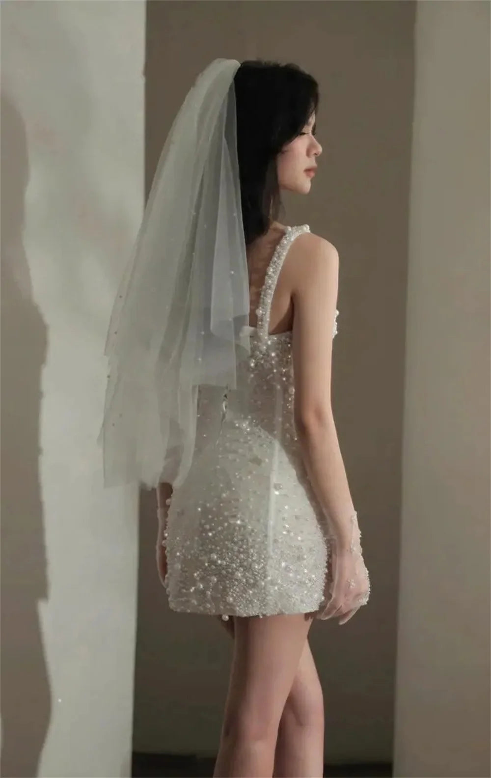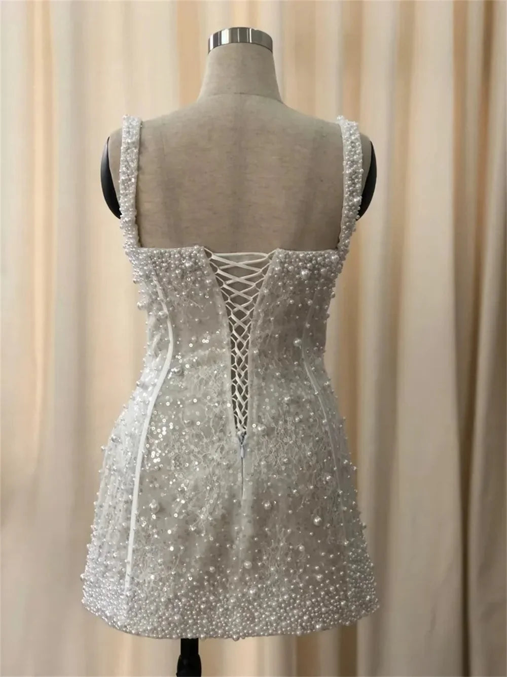 White Mini Wedding Dress Spaghetti Strap Sleeveless Bridal Lace-Up , This charming mini wedding dress brings effortless elegance to your special day. Delicate pearl beading adorns the spaghetti straps and sweetheart neckline, while the structured sheath silhouette skims just above the knee for a flattering, modern look. The lace-up back closure lets you customize your fit perfectly, and boning provides beautiful structure throughout. Whether you're saying "I do" in a garden setting or exchanging vows on sandy shores, this dress captures romantic vibes with playful sophistication. Perfect for the bride who wants to dance, twirl, and celebrate without sacrificing style.