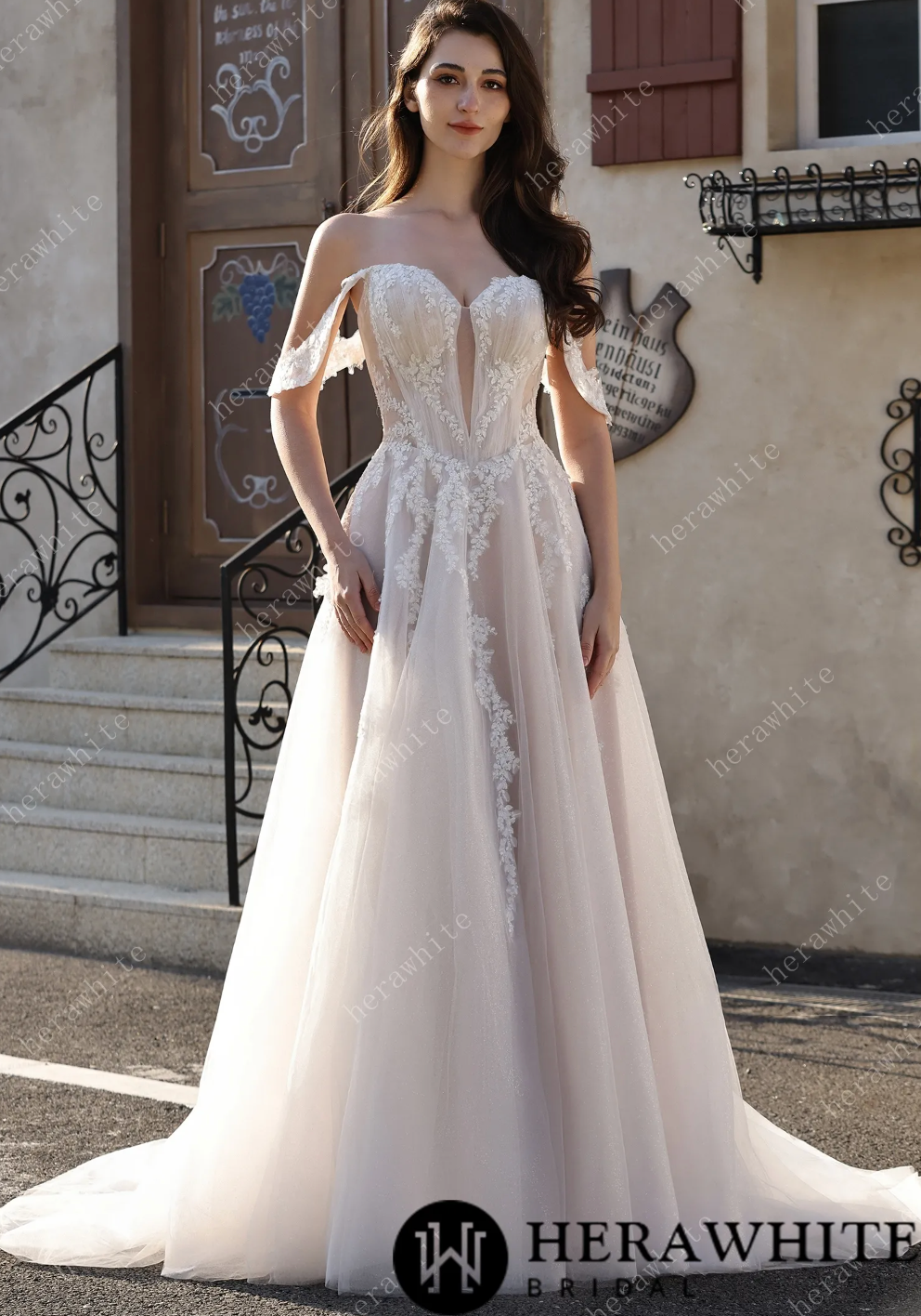 Vestido de novia moderno y glamoroso con hombros descubiertos, abertura hasta el muslo y delicadas mangas de encaje.