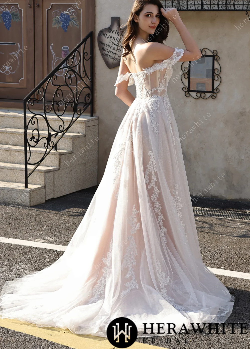 Experimenta la sofisticación de este vestido de novia con hombros descubiertos y una sensual abertura hasta el muslo. Con un estilo ajustado y un elegante drapeado que realza la cintura, este vestido es una versión moderna de la moda nupcial tradicional. Las mangas de encaje transparente aportan un toque delicado y femenino, mientras que la elegante falda fluye con gracia. La cola desmontable, que se vende por separado, ofrece opciones versátiles de estilo y sin duda será un detalle destacado.