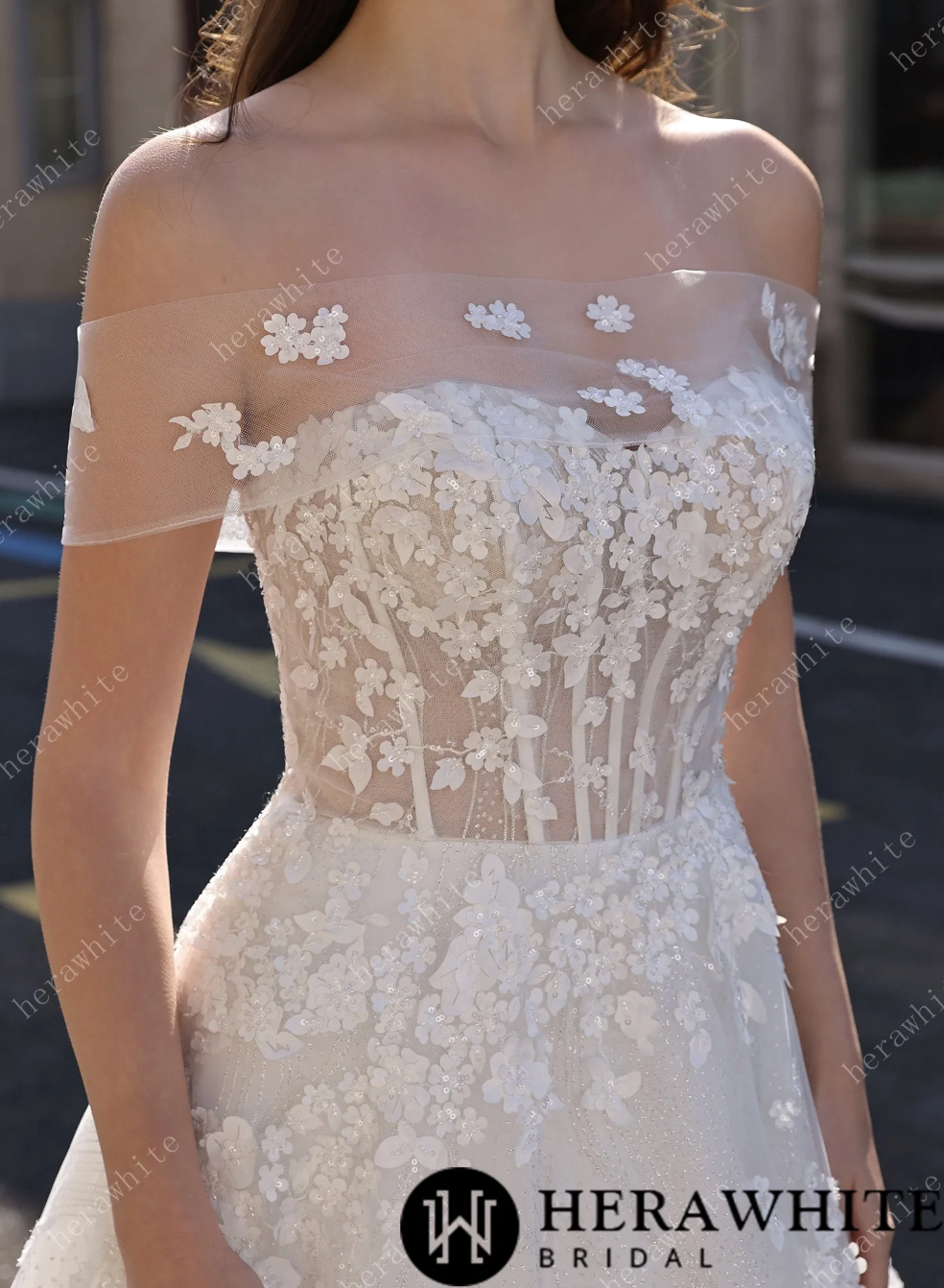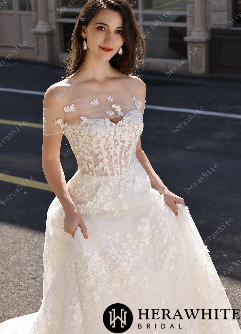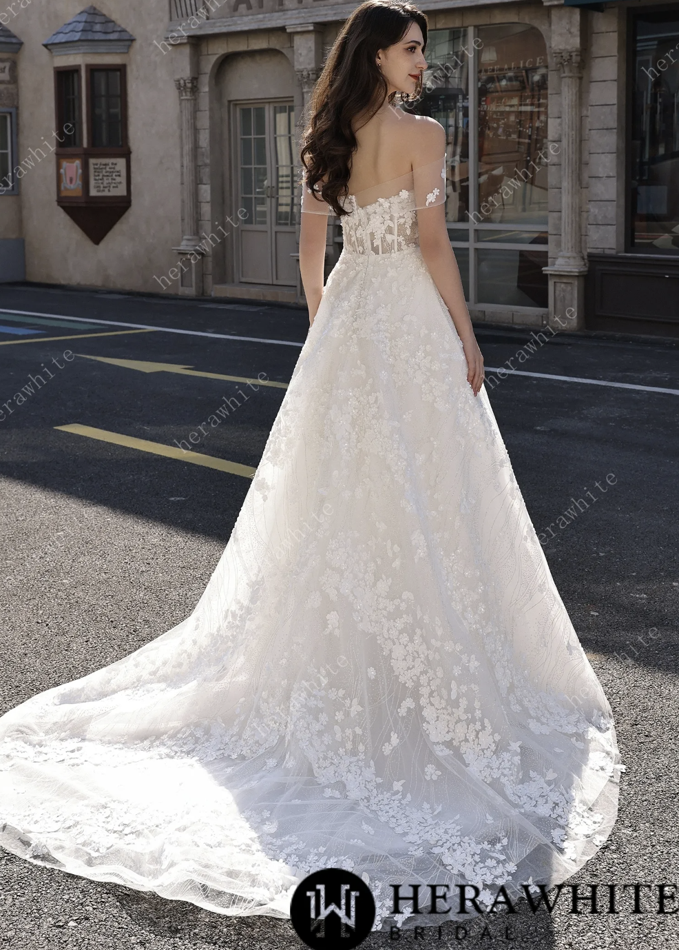 Vestido de novia moderno y glamoroso con hombros descubiertos, abertura hasta el muslo y delicadas mangas de encaje.