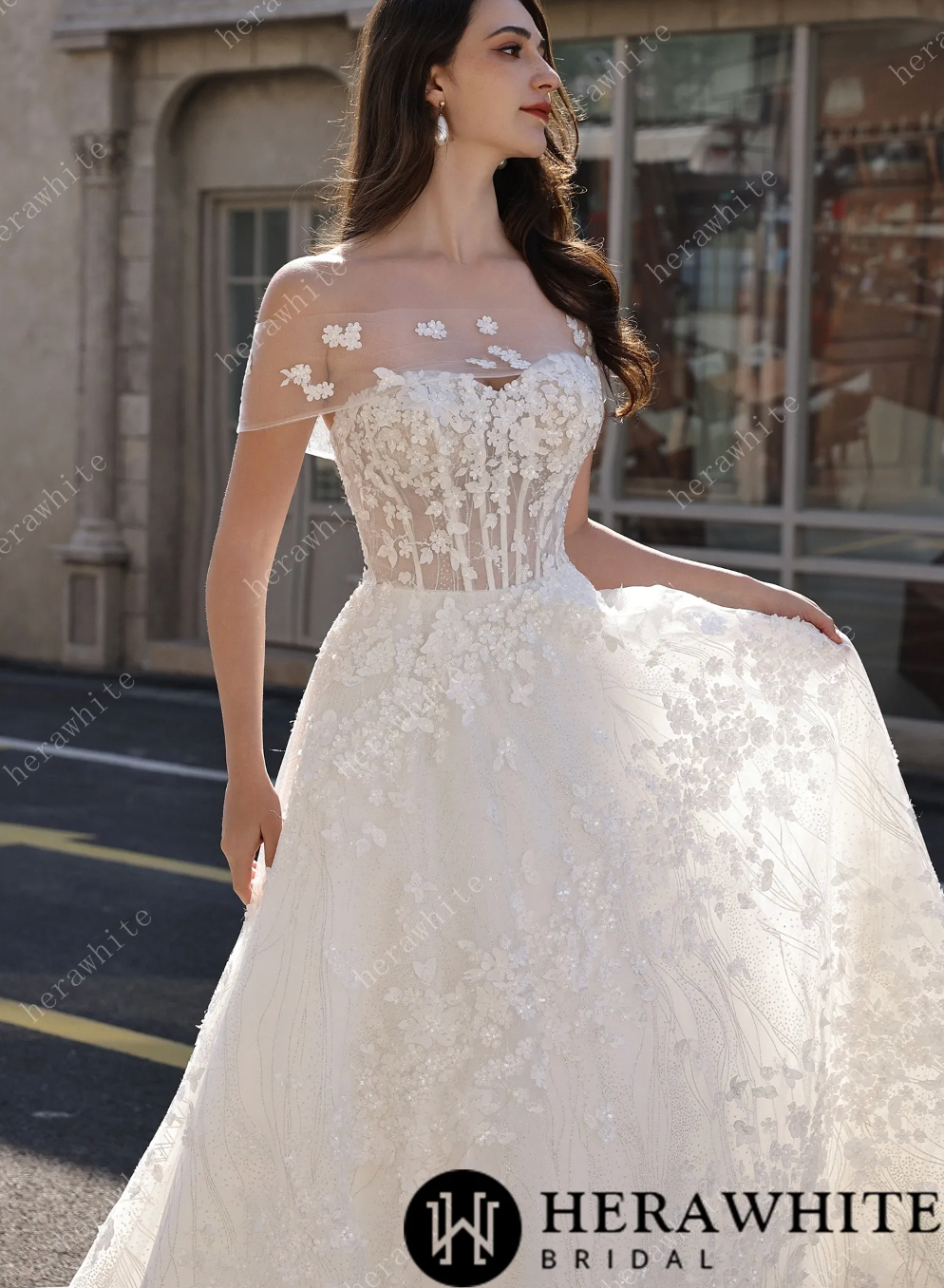 Experimenta la sofisticación de este vestido de novia con hombros descubiertos y una sensual abertura hasta el muslo. Con un estilo ajustado y un elegante drapeado que realza la cintura, este vestido es una versión moderna de la moda nupcial tradicional. Las mangas de encaje transparente aportan un toque delicado y femenino, mientras que la elegante falda fluye con gracia. La cola desmontable, que se vende por separado, ofrece opciones versátiles de estilo y sin duda será un detalle destacado.