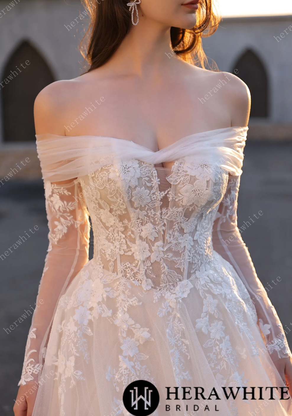 Experimenta la sofisticación de este vestido de novia con hombros descubiertos y una sensual abertura hasta el muslo. Con un estilo ajustado y un elegante drapeado que realza la cintura, este vestido es una versión moderna de la moda nupcial tradicional. Las mangas de encaje transparente aportan un toque delicado y femenino, mientras que la elegante falda fluye con gracia. La cola desmontable, que se vende por separado, ofrece opciones versátiles de estilo y sin duda será un detalle destacado.