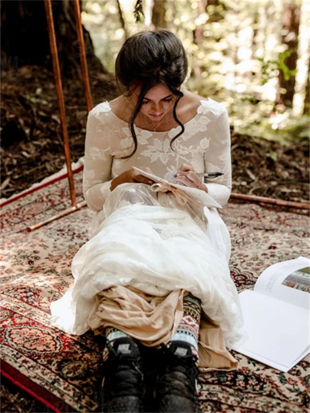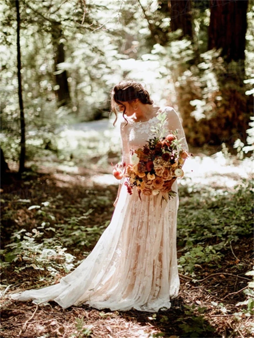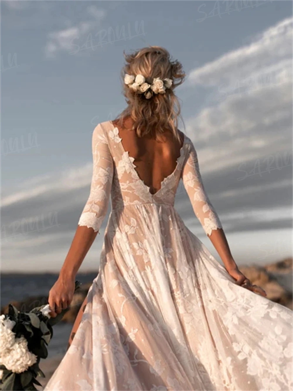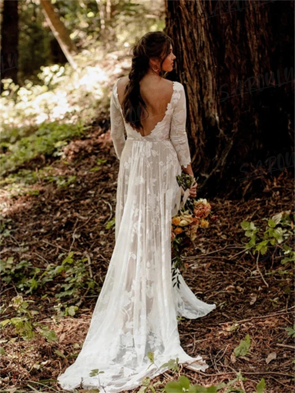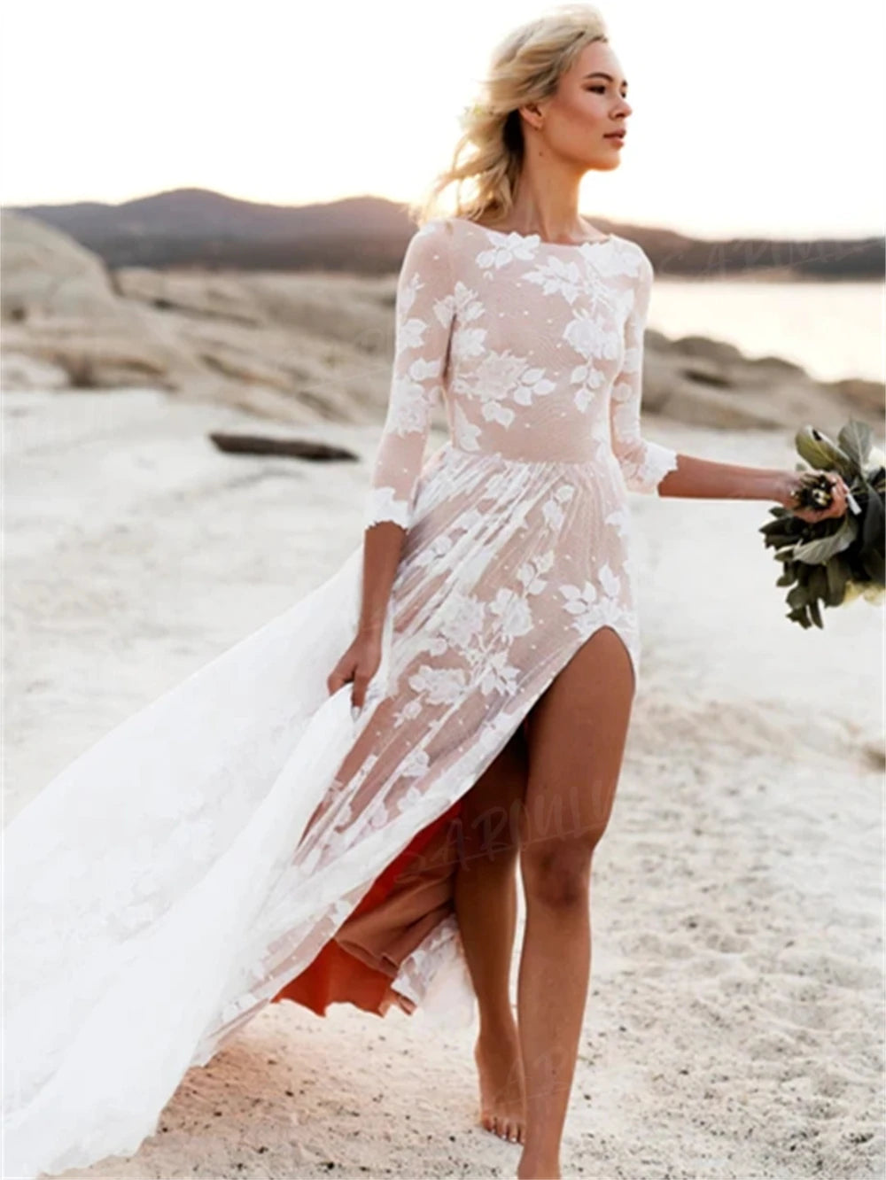 Bohemian Wedding Dress Long Sleeve A-line With Leg Slit Bridal Gown, say "I do" to effortless elegance with this dreamy bohemian wedding dress! Crafted in delicate lace, this A-line gown features a flirty front leg slit, romantic 3/4 length sleeves, and a daring deep V-back that'll have everyone swooning. The flowing train adds that ethereal touch without the fuss, making it perfect for beach ceremonies, garden celebrations, or countryside affairs. Comfortable, affordable, and undeniably gorgeous—because your wedding day should feel as amazing as you look.