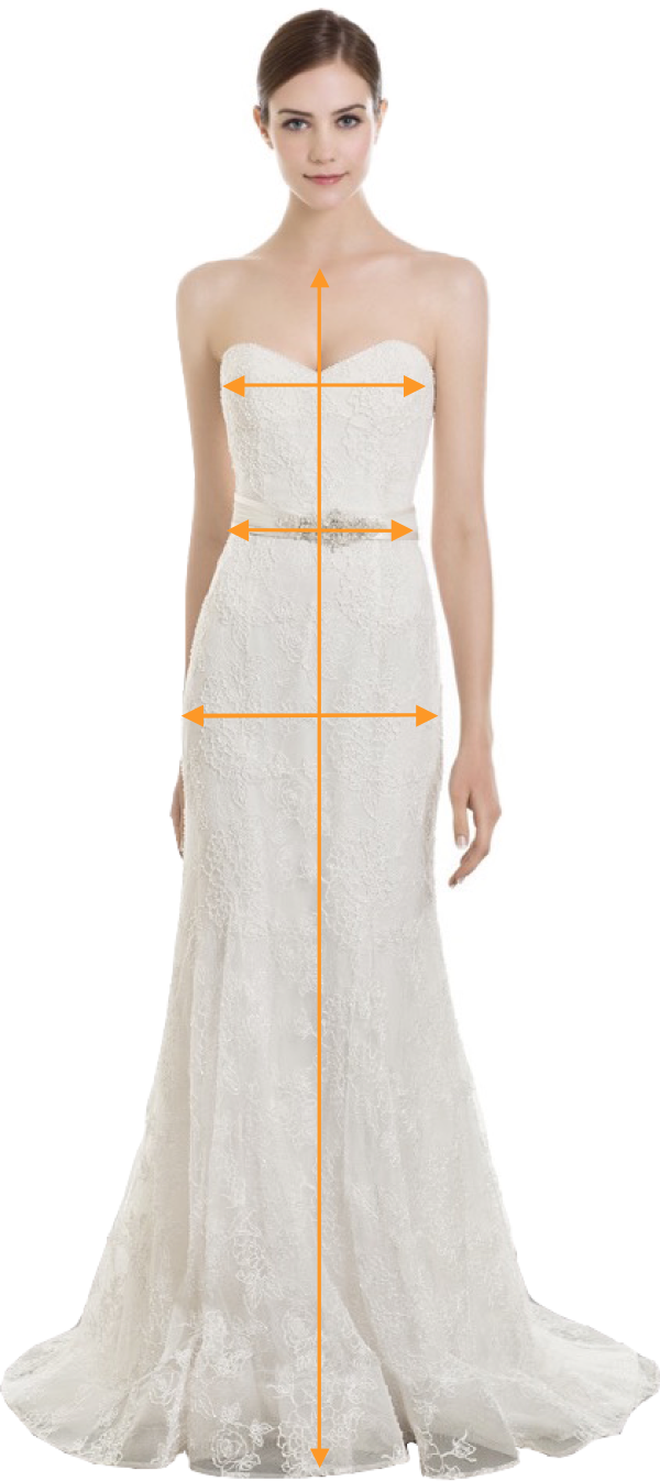Measure with undergarments similar to those you will wear with your dress; do not measure over other clothing. Make sure the measuring tape is parallel to the floor and pulled evenly across the body with no slack.